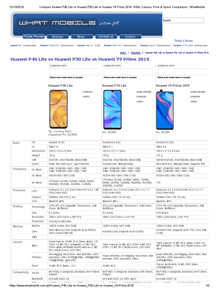 Compare Huawei P40 Lite Vs Huawei P30 Lite Vs Huawei Y9 Prime 2019 Pdf Autofocus Mobile Telecommunications
